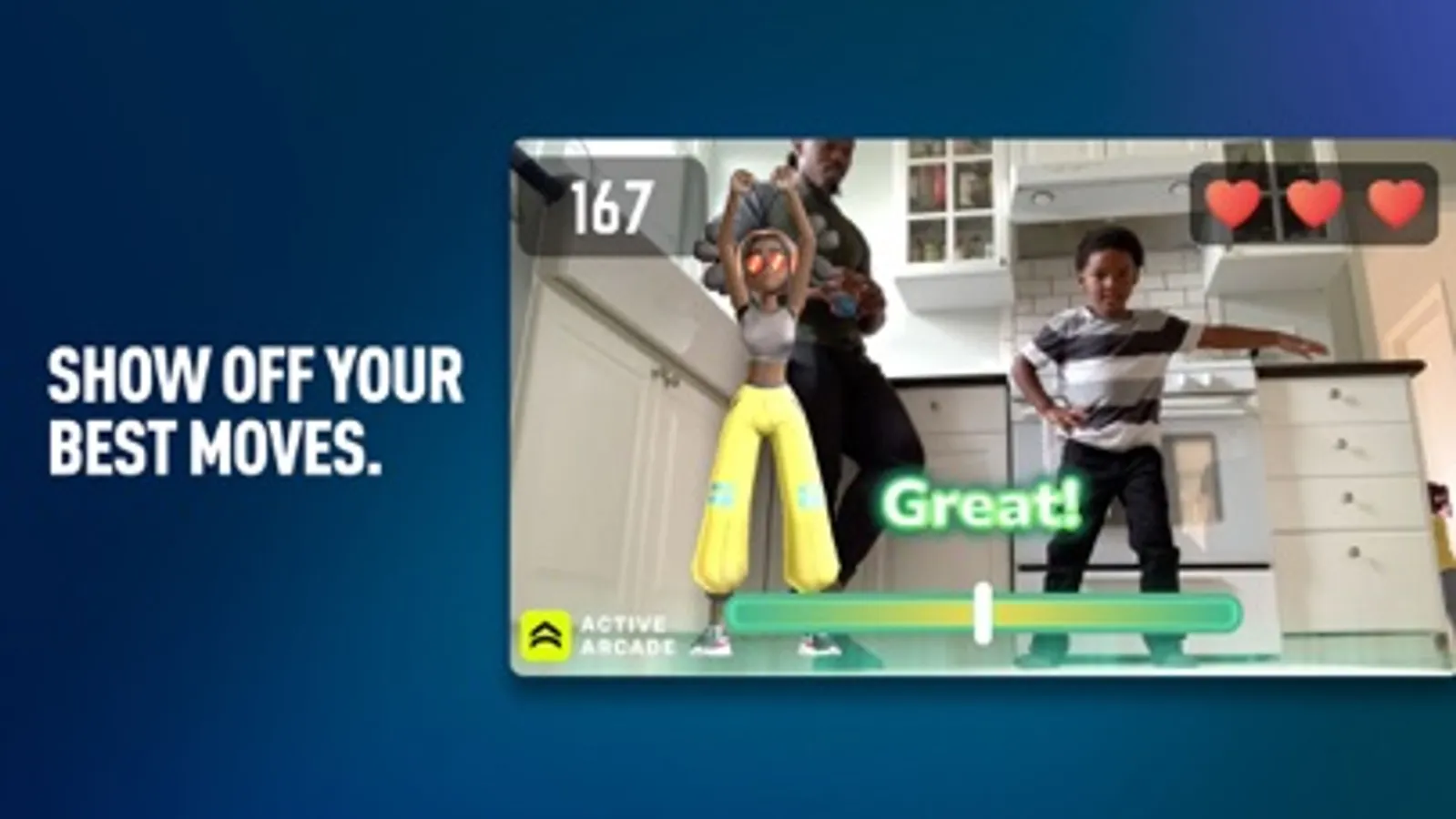 Active Arcade requires no special setup, wearables, or extra equipment. Just lean your iPhone or iPad against a stationary object like a chair, water bottle, or wall, and ensure the front-facing camera can see your full body. For an even more immersive living room experience, connect your device to a TV through AirPlay or HDMI connection.