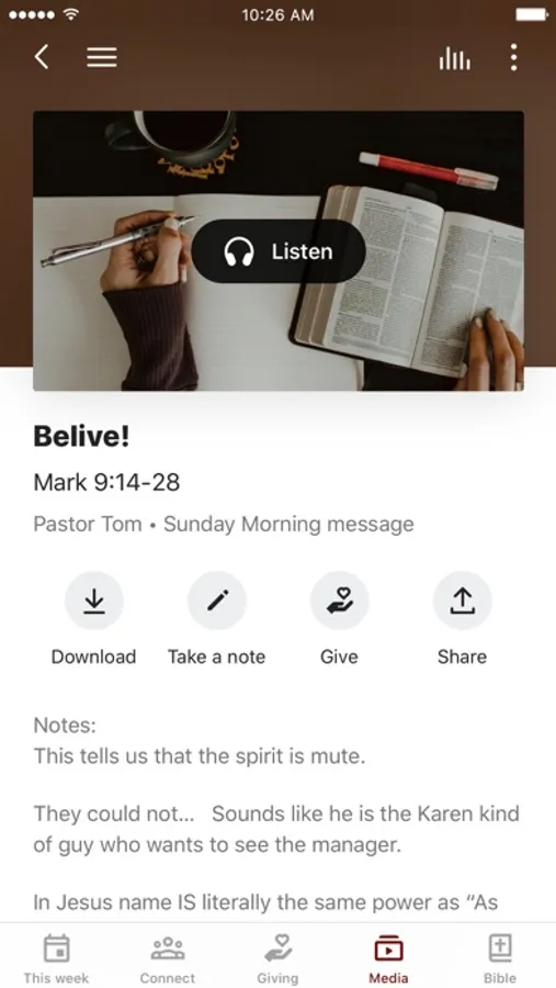 This app will help you stay connected with the day-to-day life of our church. With this app you can: watch or listen to past messages; stay up to date with push notifications; share your favorite messages via Twitter, Facebook, or email; and download messages for offline listening.