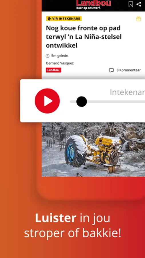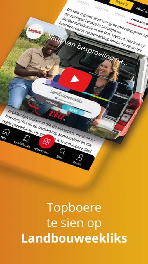 Word ’n intekenaar op die Landbou.com-app en kry toegang tot die jongste Landbouweekblad (nog voor dit die rak tref) én ’n argief van vyf jaar se uitgawes, sowel as elke uitgawe van ons spesiale tydskrifte Boerekos, Boereplanne, Vee, Tegnologie en Herlewing. Ons landboujoernaliste en medewerkers, wat wetenskaplikes, ekonome en markspesialiste insluit, skryf oor onderwerpe wat wissel van tegnologie en herlewingslandbou tot landbou-ekonomie en politieke vraagstukke.