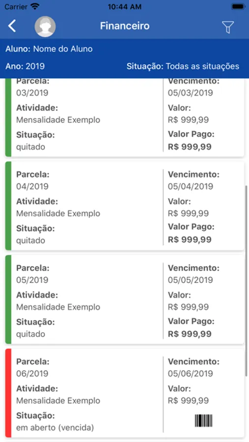 - Consulta ao extrato financeiro e emissão de boleto (apenas para os responsáveis financeiros).