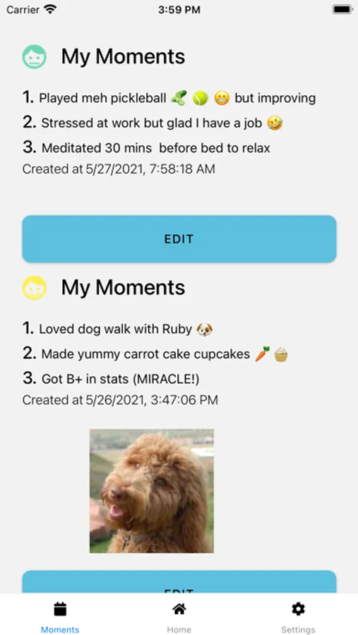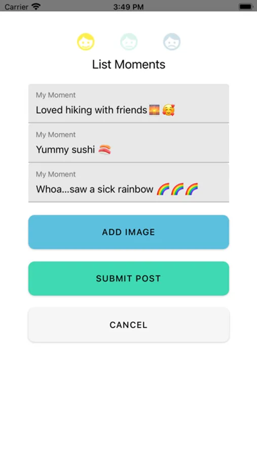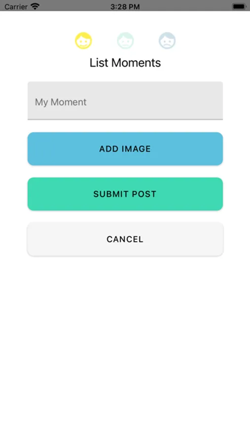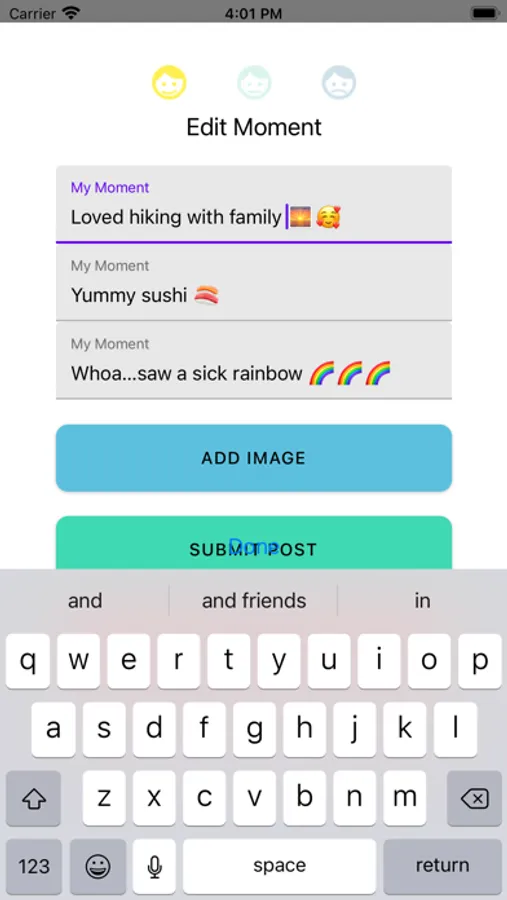 3) Create a post or "happy moment" to record gratitude moments from your day. These can be reviewed and edited in the moments tab by pressing the bottom left icon in the navbar.