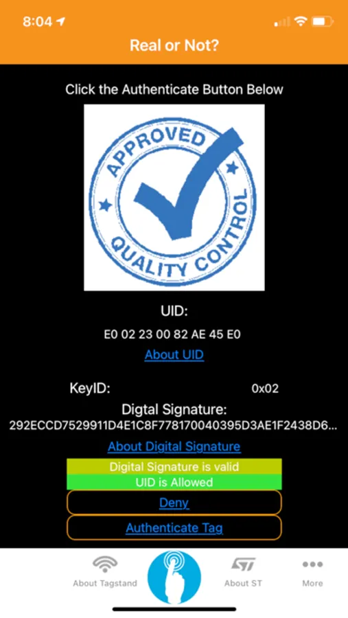 Use your iPhone to scan product authentication tags (produced by Tagstand and based on the ST25 NFC chips) to verify its digital signature. The app connects to a live cloud UID lookup service. Use the "allow" feature to update a UID from "Deny" to "Allow" on the database.