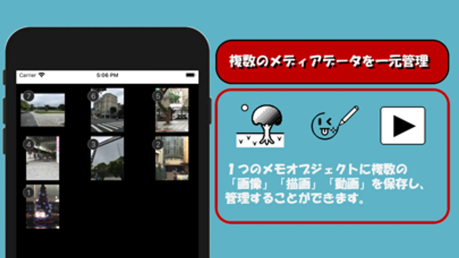 → 動画を複数記録できます。メディアはフォトライブラリーもしくはカメラを選択できます。