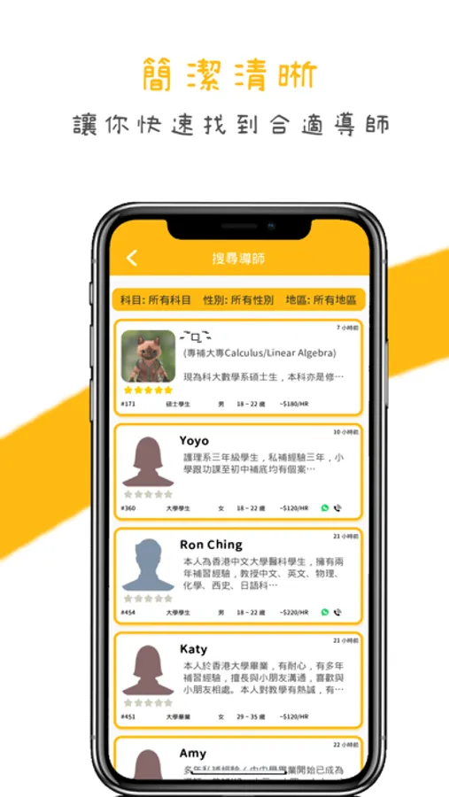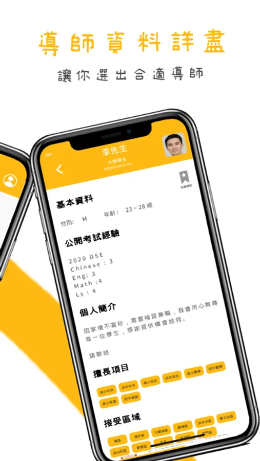導師可選擇公開或不公開聯絡資訊, 家長可直接透過導師所公開的資訊聯絡導師或使用應用程式內建的信息功能