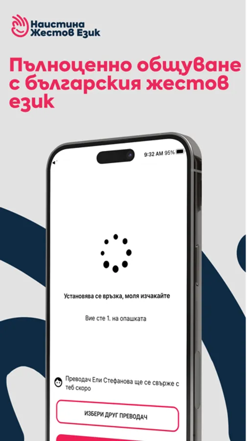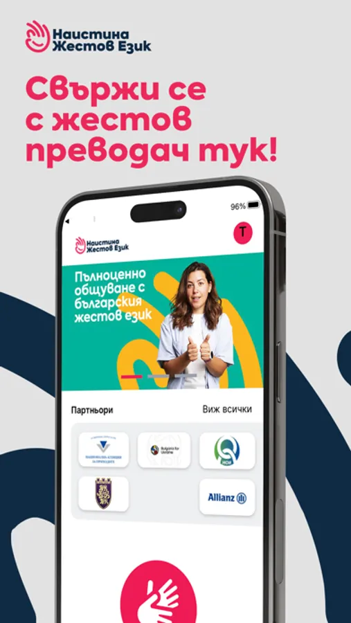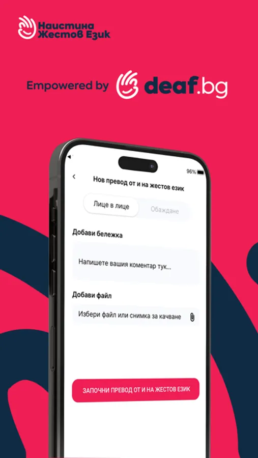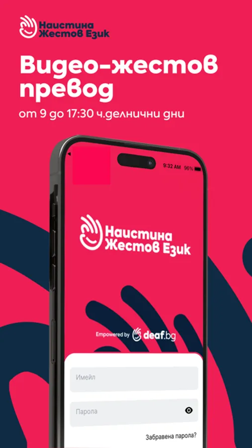 Приложение DEAF BG: Разбийте всякакви комуникационни бариери с нашето иновативно приложение. Свържете се със сертифицирани преводачи от и на български жестов език в реално време. Вижте кои институции осигуряват условия чрез български жестов език и провеждайте вашите телефонни разговори със съдействието на преводач от и на български жестов език.