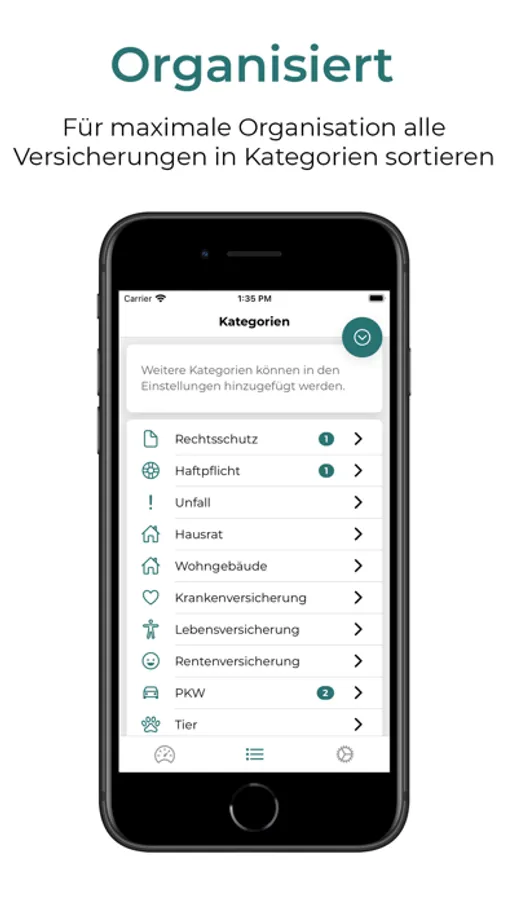 Versicherungen können in Kategorien eingeteilt werden, um maximale Organisation zu garantieren. Alle Kategorien, Konzerne und Ansprechpartner können nach Ihren Bedürfnissen angepasst werden.