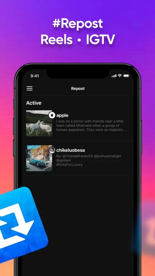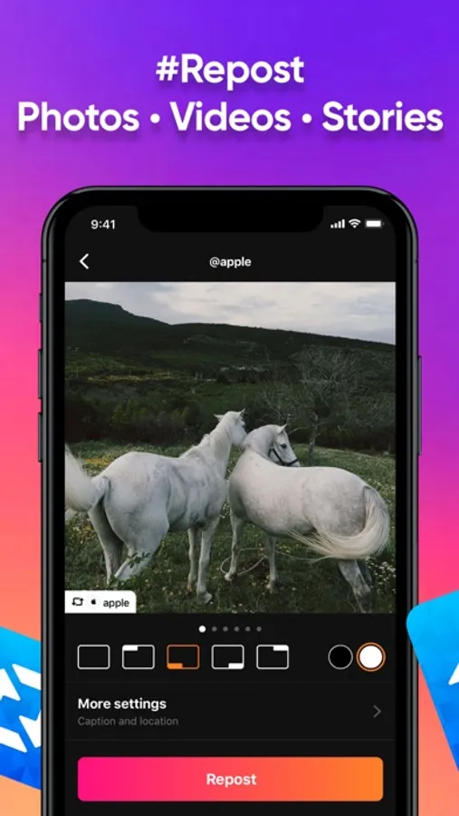 Repost IG contents (photo, video, reels, story easily. Automatically copy information such as caption and location while reposting.