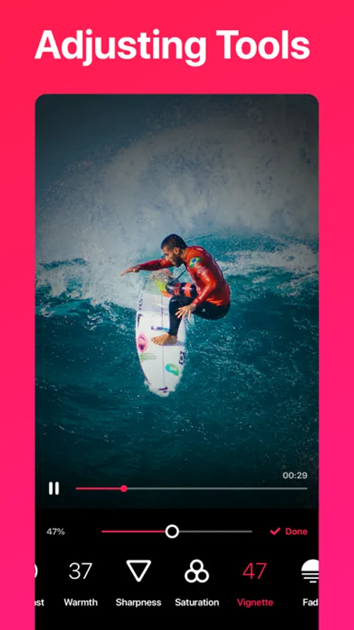 Move the slider to adjust exposure, warm, sharpness, saturation, vignette and fade.