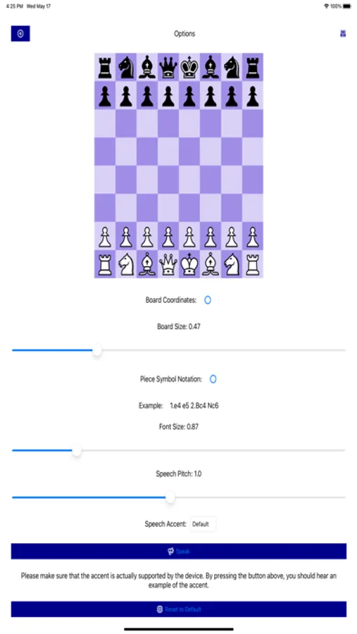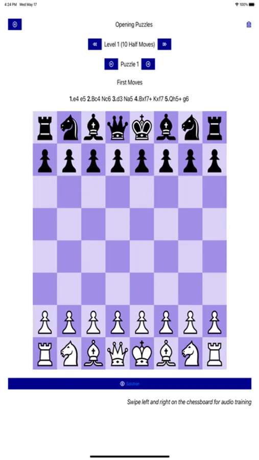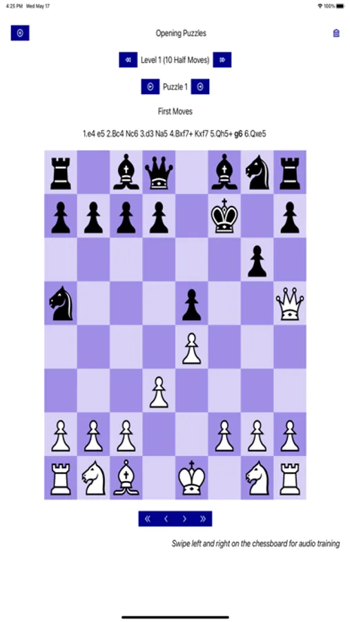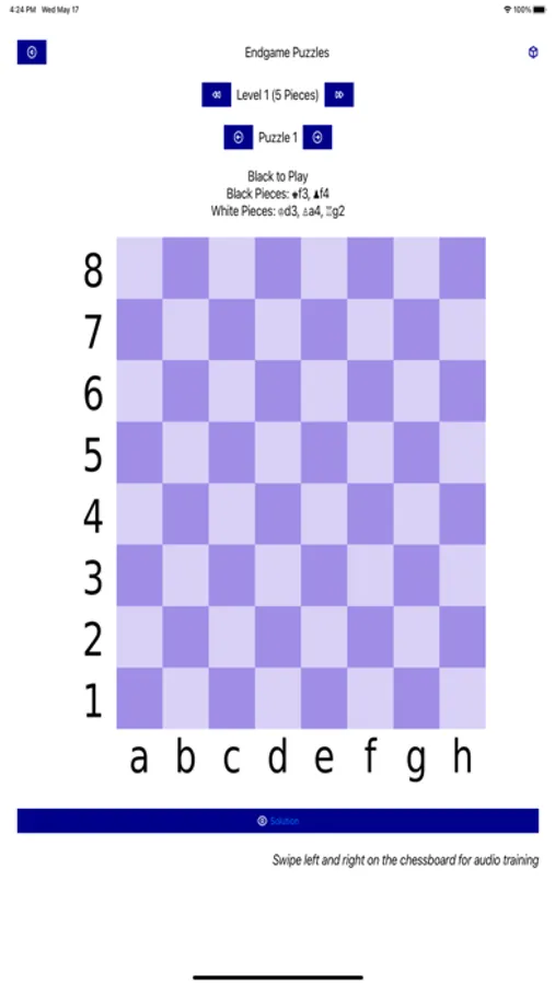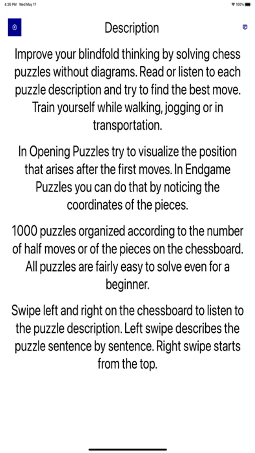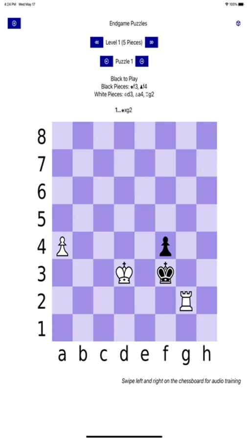 Swipe left and right on the chessboard to listen to the puzzle description. Left swipe describes the puzzle sentence by sentence. Right swipe starts from the top.