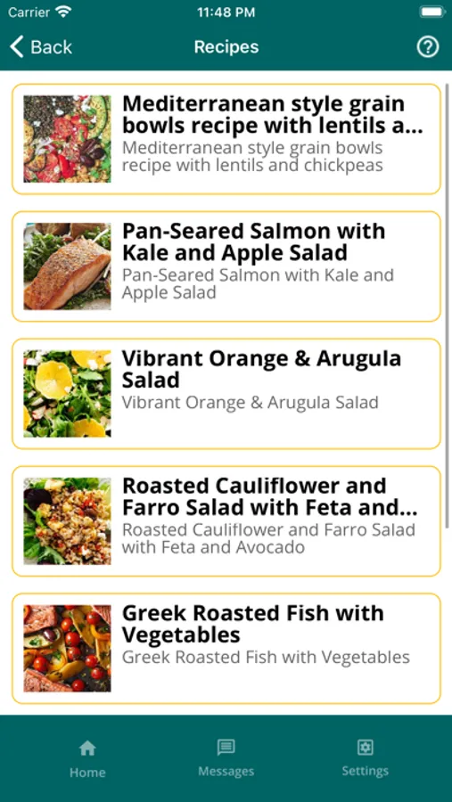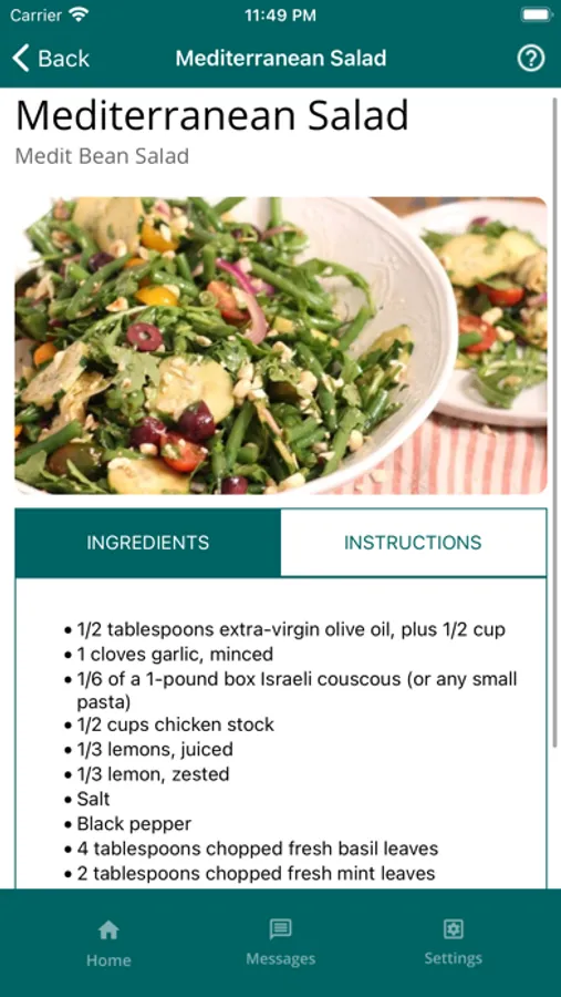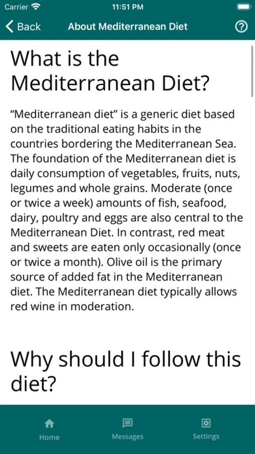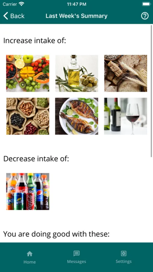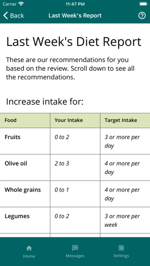 The app allows you to take a short weekly survey about foods and drinks you had in the last week. The app provides a personalized report on areas for improvement and recommends daily recipes for breakfast, lunch, dinner, and snacks based on the responses. The app also has an in-app messaging feature that supports sending and receiving texts. The app also provides information about the Mediterranean Diet and access to an extensive database of healthy recipes.