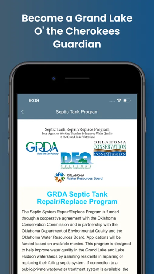 Grand Lake O' the Cherokees' watershed information at your fingertips! Learn what a watershed is, discover what lives in the lake and streams around the lake and watch our educational vidoes. Through this app, you can learn how to help us Guard the Grand!