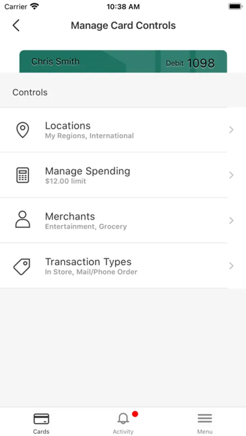Usage Controls and Alerts Set spending limits to decline transactions above your thresholds. Monitor activity by category such as gas stations and restaurants, and by type: in-store purchases, e-commerce transactions and ATM transactions.
