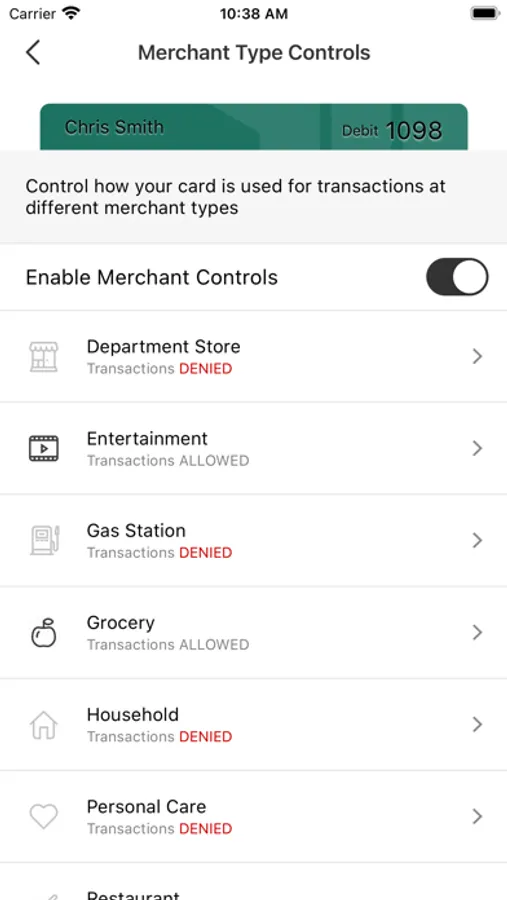 settings. When “off,” purchases or withdrawals are declined.
