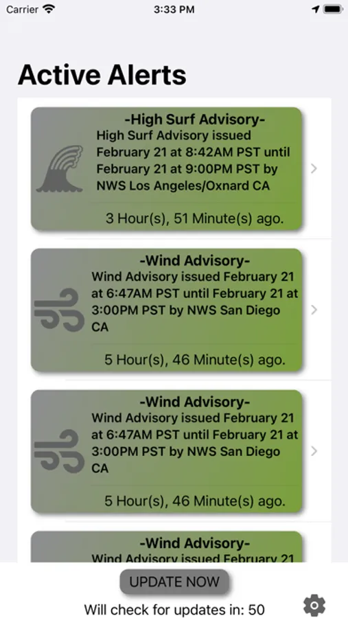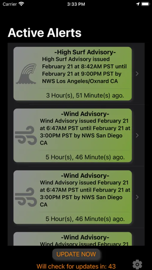 Weatherbot will check your current area for weather alerts from the national weather service and read them aloud.