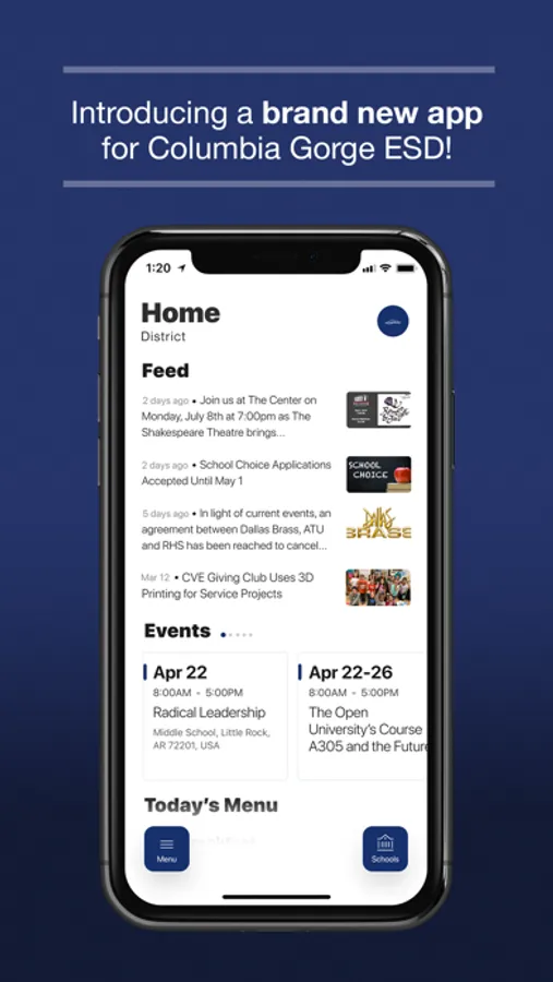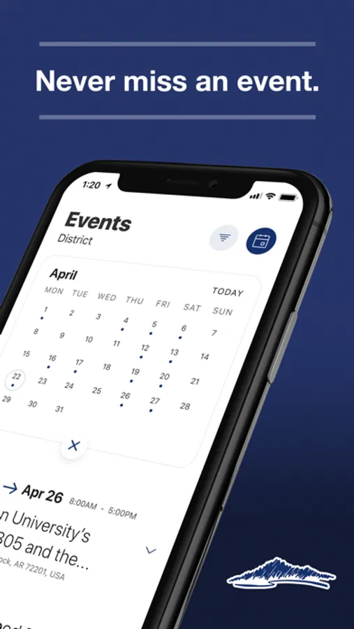 The event section shows a list of events throughout the district. Users can add an event to your calendar to share the event with friends and family with one tap.