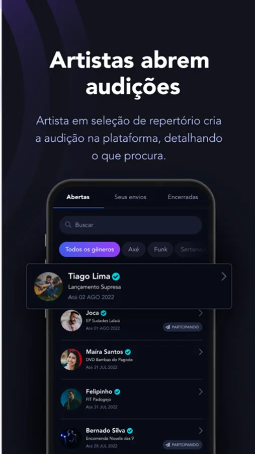 Artista em seleção de repertório cria a audição na plataforma, detalhando o que procura.