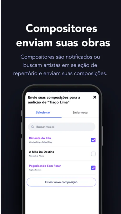 Compositores são notificados ou buscam artistas em seleção de repertório e enviam suas composições.