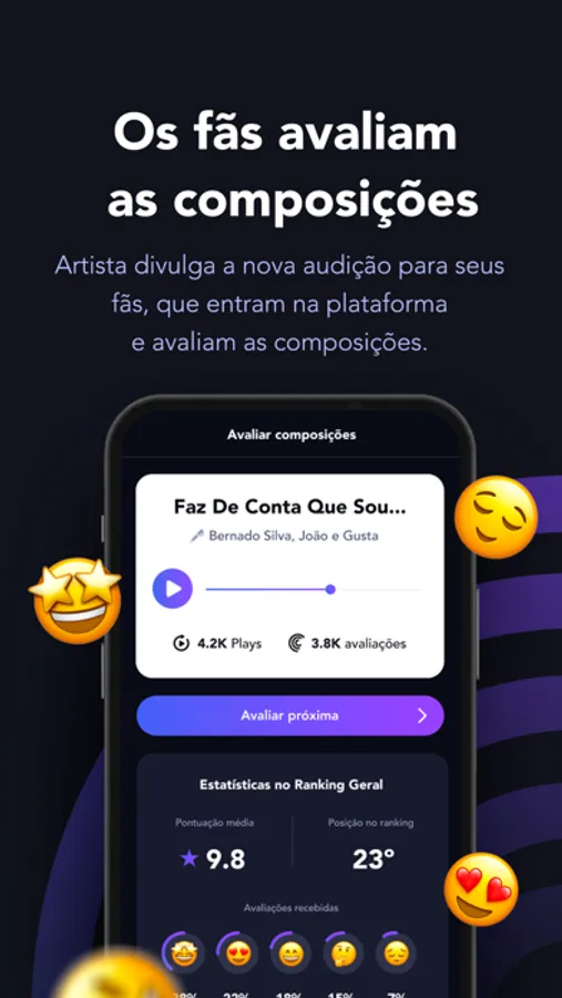 Tanto compositores quanto artistas tem uma série de estatísticas avançadas à disposição: quantidade de avaliações, comentários, plays e muito mais.