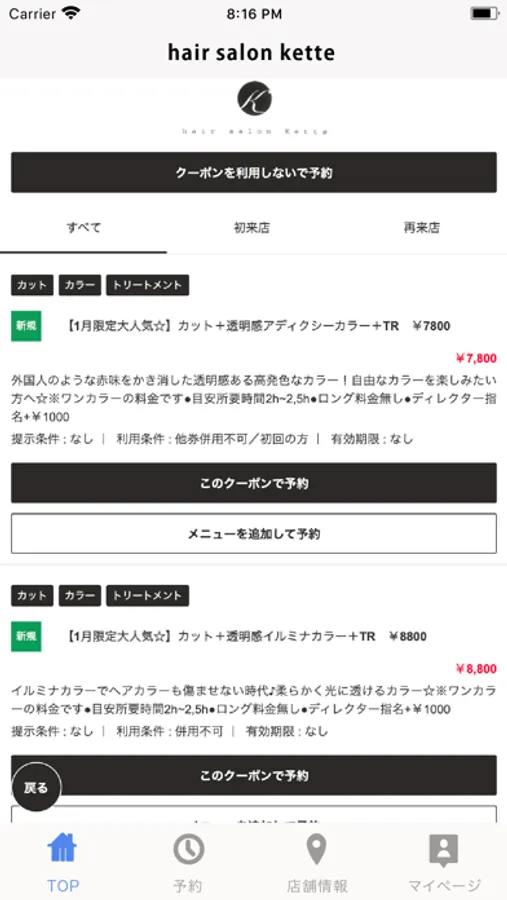 お得なクーポンが配信されます。ネット予約時にクーポン利用での予約も可能なので来店時もスムーズに施術頂けます。