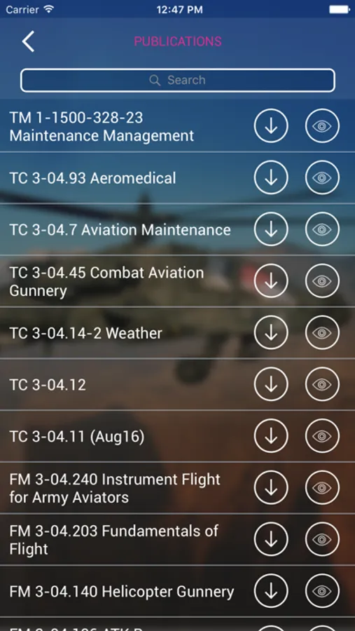 The “Aviation Study Guide” App is your one-stop shop for the AH-64D/E, UH-60A/L, UH-60M, UH-72A, and CH-47F. This app includes over a dozen different Publications & Miscellaneous PDFs that you may view online or download and view offline.