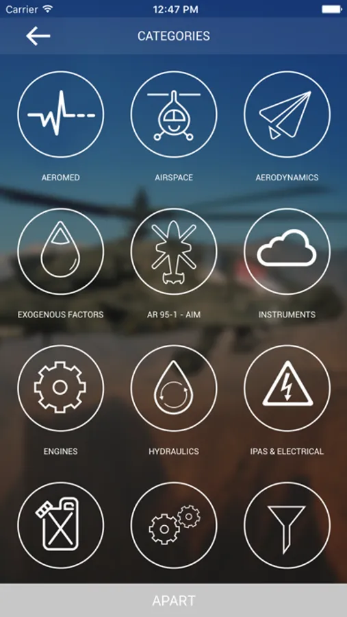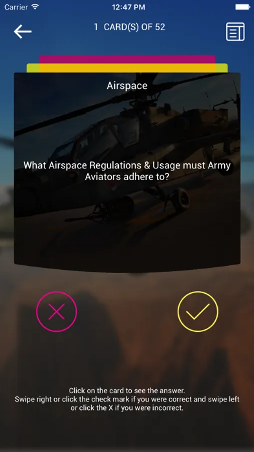 Looking for some flash cards? We have over 800 flash cards for each aircraft, covering almost 20 different subjects. Our flash cards cover a wide variety of questions that can assist for general knowledge or that upcoming APART. There’s a dedicated “APART” study button that compiles all questions for your review. Our flash card interface will also allow you to review any questions you may have been unsure of at the end. Tired of looking at the same flash cards in the beginning? Click the Options menu and you can shuffle the cards to have variation each time you study.