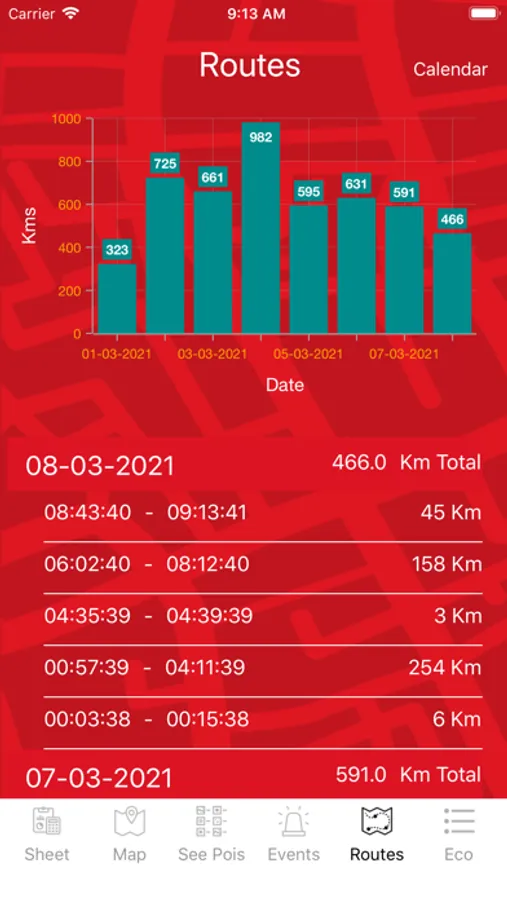 Para cada recorrido, además de la representación en el mapa, también se muestra el kilometraje realizado así como el tiempo empleado en recorrerlo.