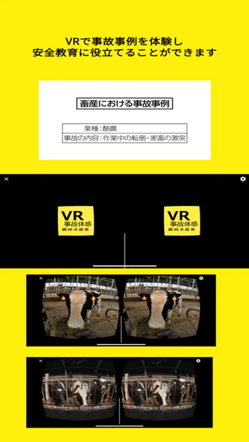 畜産業VR作業事故体験アプリは、作業中の事故を実写VR映像で体感することができる、畜産業に携わる方向けのアプリです。現場での安全意識の向上を目的とし、事故防止に役立つ情報も併せてご提供しています。