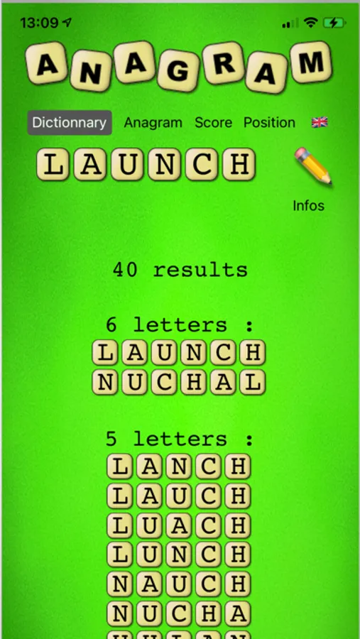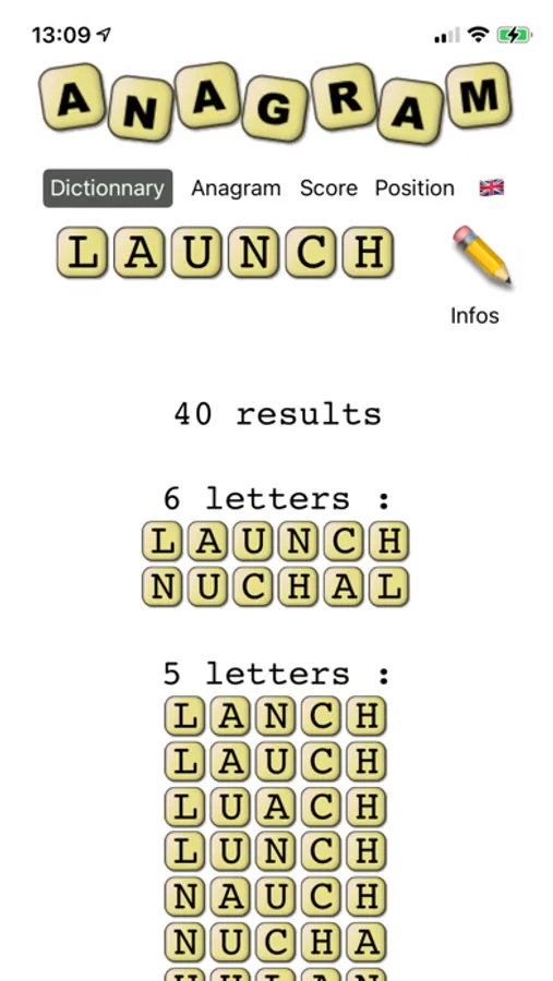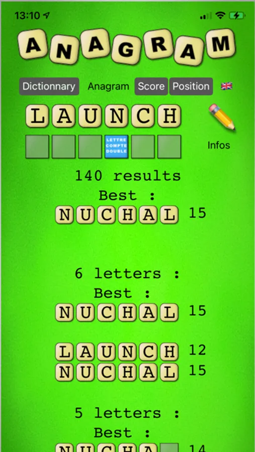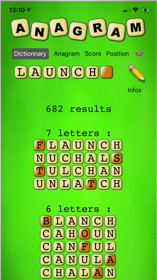 A letter shaker app useful with all word's games. You can search the anagrams in the official dictionary, or get all the combinations of letters. You can add blanks, and search the best score depending of the position on a bonus square.