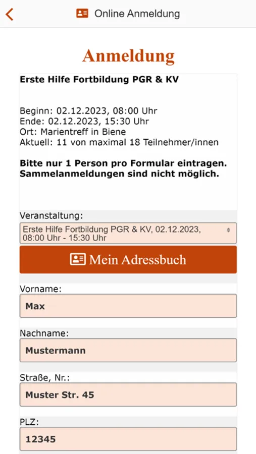 - Anmeldungen zu Veranstaltungen mit eigenem lokalen Adressbuch, um Anmeldungen mit wenigen Klicks durchführen zu können