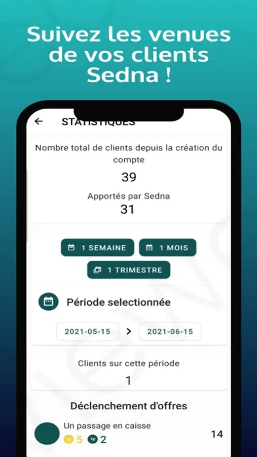 - Avoir accès à des statistiques sur le nombre d'offres que vous avez déclenchées, ainsi que sur votre nombre de clients Sedna sur une période donnée (une semaine, un mois ou un trimestre).