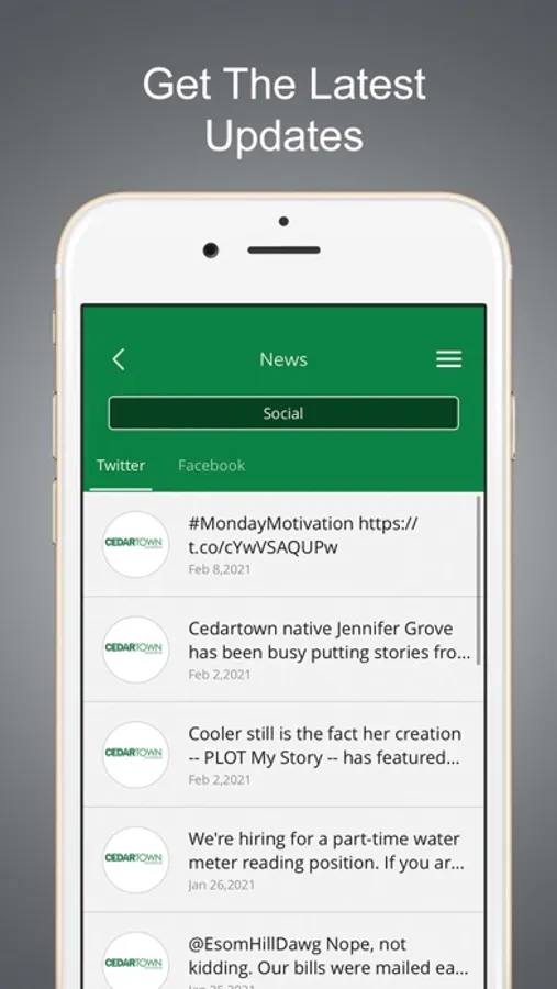 Become a civic citizen and engage with your city like never before by downloading the official app. With features like Online Bill Pay, Report an Issue, Local Directory, Plan a Visit, and other FAQs you'll find it easier than ever to stay connected with the City of Cedartown with just a few taps on your mobile device.