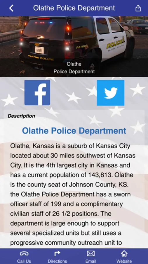 On behalf of the men and women of the Olathe Police Department, welcome to our app. We are dedicated to improving the quality of life in our city through relentless problem solving and working in partnership with our larger community.