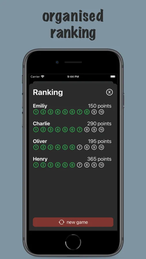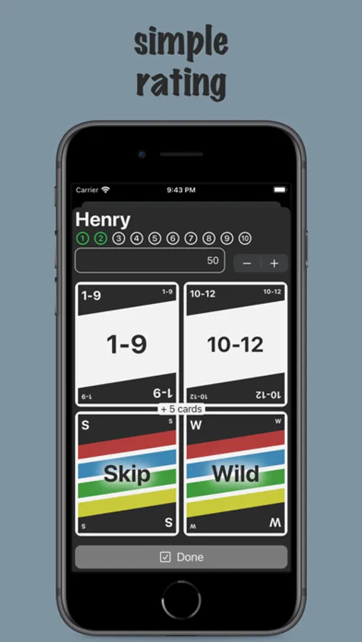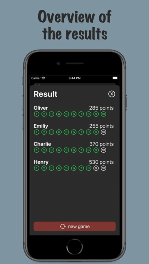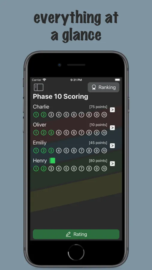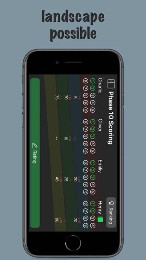 Phase 10 scoring provides a remedy. Just enter the players and geht started. When a round has ended, you can enter the phases as well as the remaining cards after which the points are automatically summen up. With the cards shown, you don't even have to know the points for each card, just type it in and the correct number of points will be added.