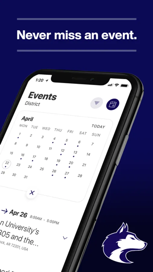 The event section shows a list of events throughout the district. Users can add an event to your calendar to share the event with friends and family with one tap.