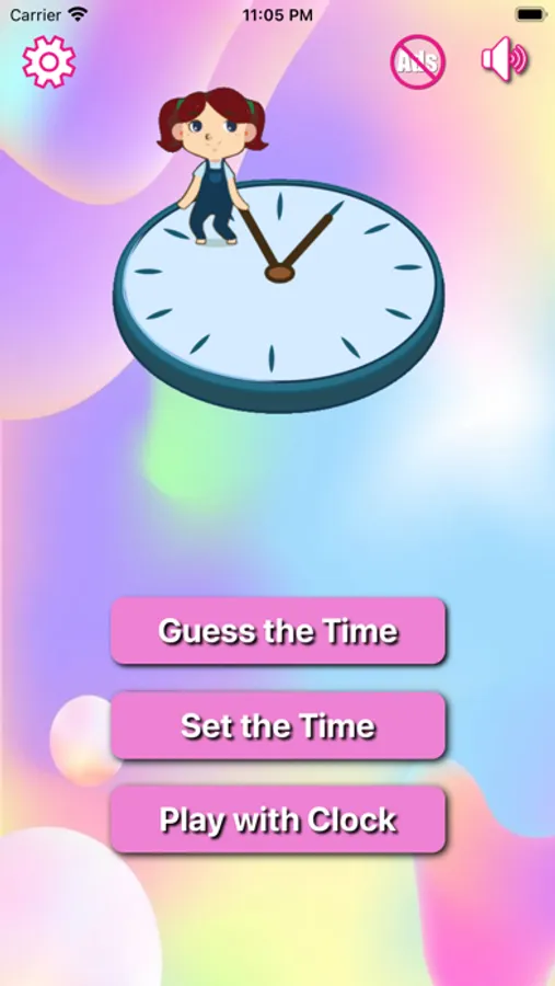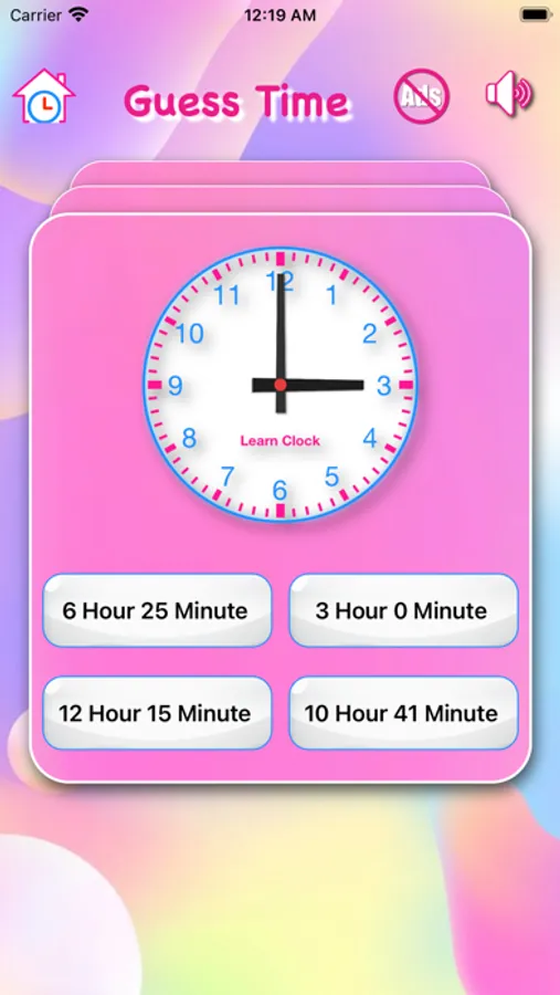 This app is featuring 'Learn clock' and 'Guess time'.
