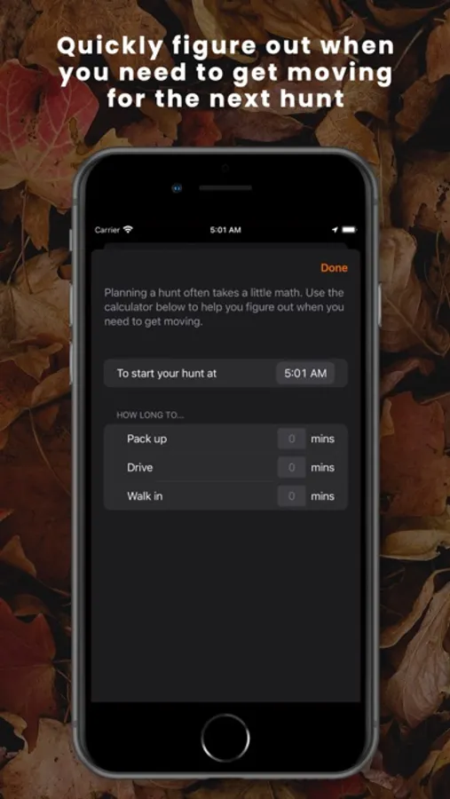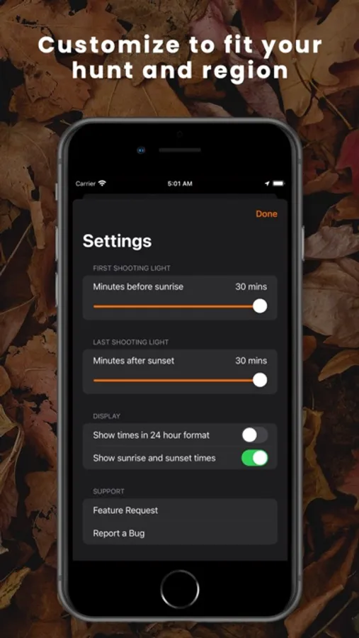 Did work let out early? Catch an unexpected break from the family? Finish the chores in time for an evening hunt? Open Shooting Light to see how many hours of hunting you have left for the day. It might just be the thing that helps you decide to get out and sends you home with that next big buck.