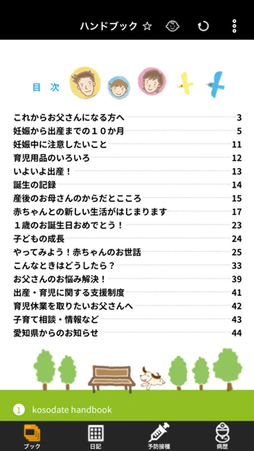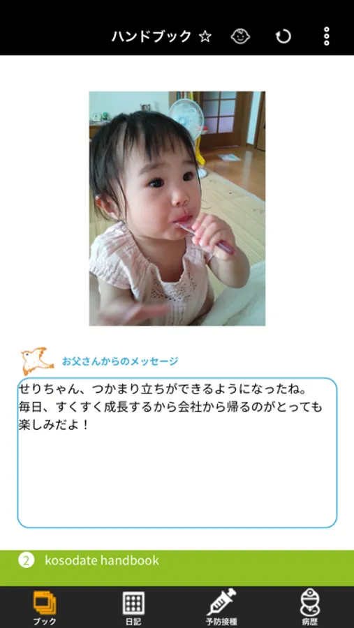 このアプリケーションはお父さんが子育てをする時のガイドとしてご活用いただくとともに、お子様の成長や思い出を記録したり、写真を登録することができる日記・アルバム機能を備えています。また、予防接種の予定や実施日、病歴なども登録でき、大切なお子様を守ることに繋がります。