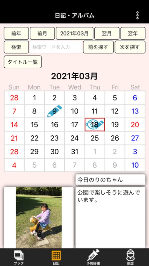 このアプリの日記・アルバム機能を利用すると、カレンダーから日々の出来事やお子様の写真を登録することができます。