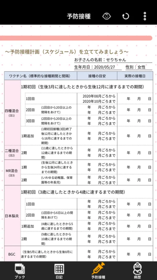 予防接種は、お子様を感染症から守るためにとても大切です。このアプリにはお子様が受けた予防接種について記録できる機能がありますので、スケジュール管理にお役立てください。