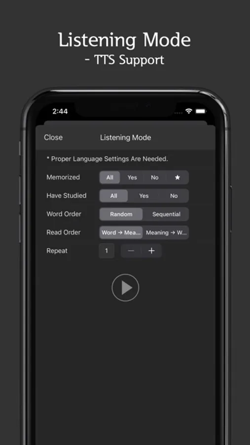 - comfortable dark mode, quiz-modes, push alarm at time user sets