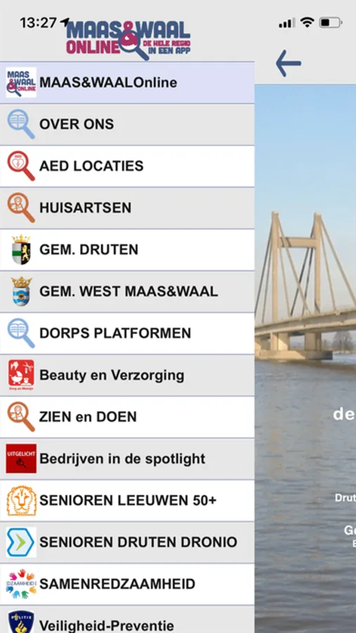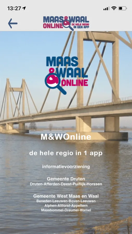De app bevat veel informatie voor inwoners en toeristen over het Land van Maas en Waal, Gemeente West Maas&Waal - Gemeente Druten - Gemeente Wijchen en Gemeente Beuningen..
