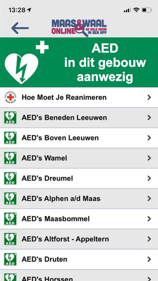 Het blok AED locaties bevat adresgegevens en route naar waar AED apparaat hangt en kan levensreddend zijn.