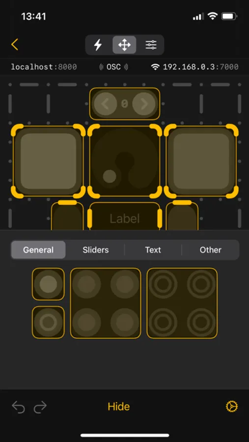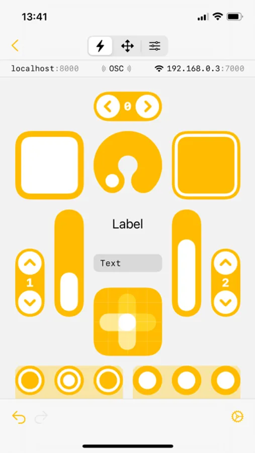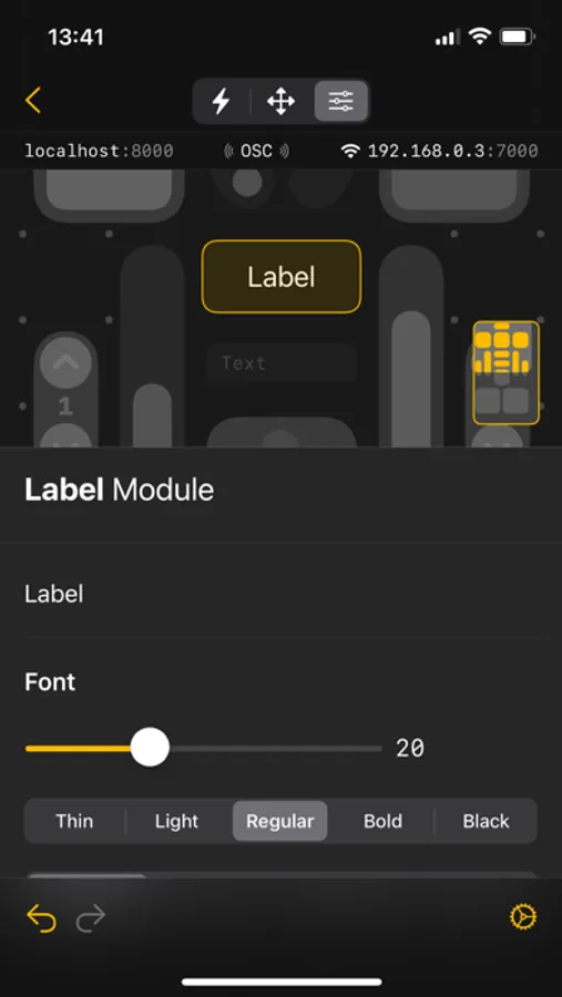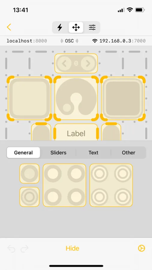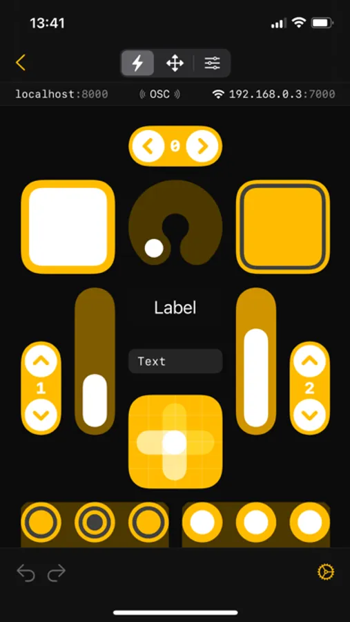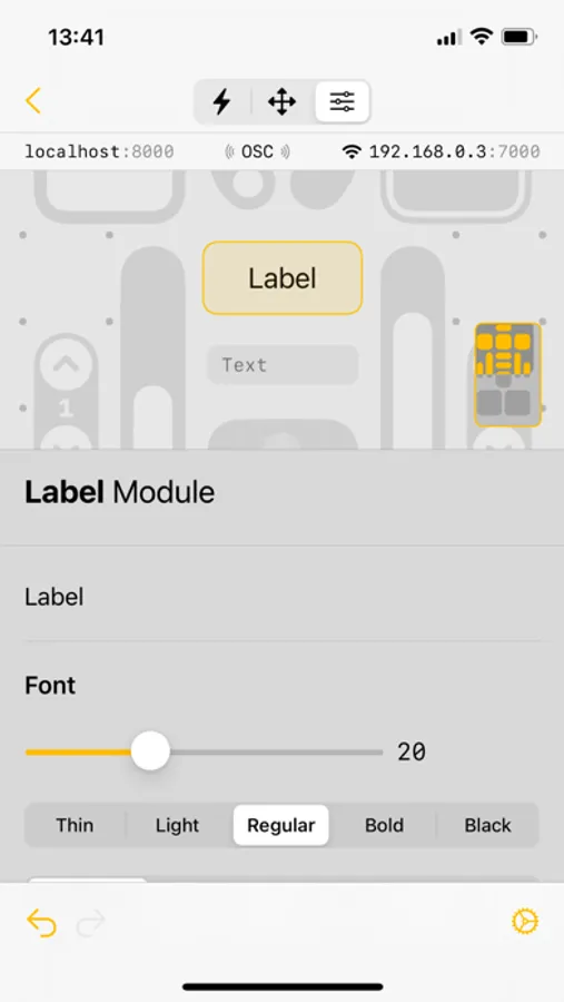 Custom modules include button, label button, toggle, slider, rotary, joystick, counter, options, label, text field, indicator, progress, trail, stack of sliders and grid of buttons and toggles.