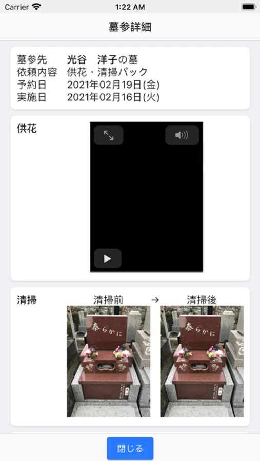 指定日に現地スタッフが墓前に出向き、花束を手向けながらお墓参り映像(1分)を撮影。スマホでいつでも何度でもみることができるようになります。