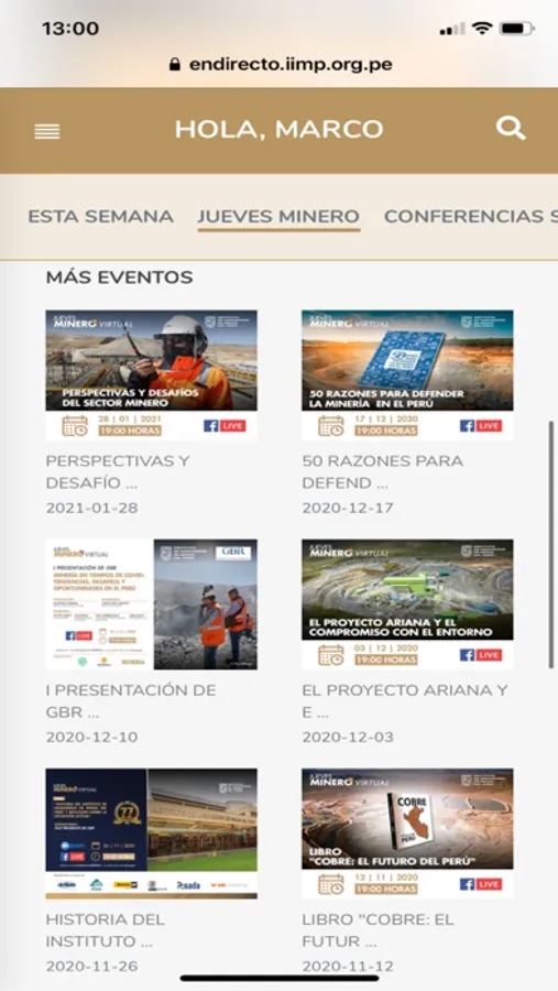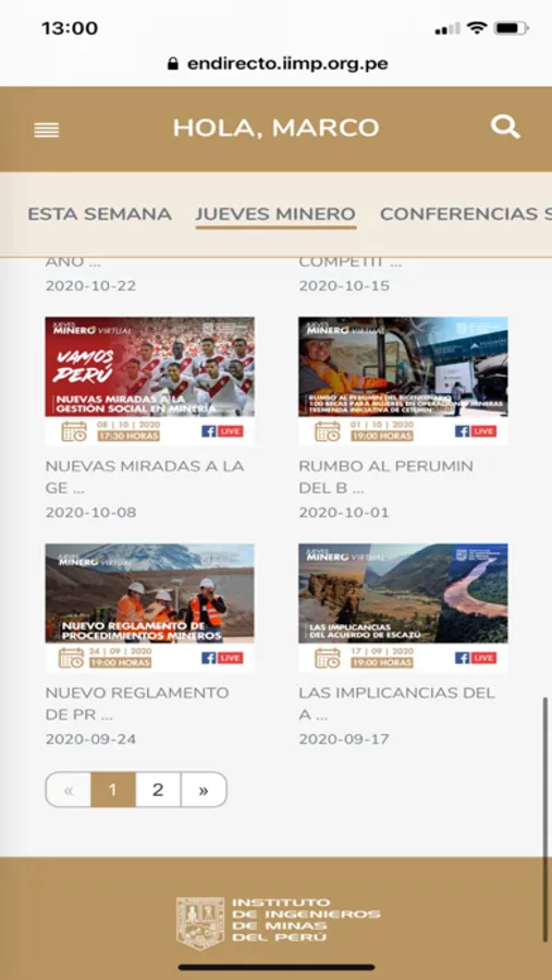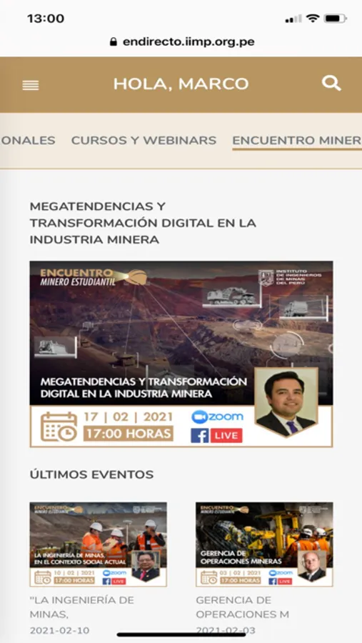 En Directo del Instituto de Ingenieros de Minas del Perú es un aplicativo web que, entre otras cosas, permite el trasvase de información de una forma de ordenada, amigable y digerible para todos los interesados que quieran acceder a todo su contenido audiovisual.