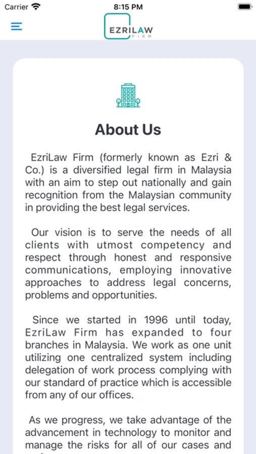 EzriLaw Firm (formerly known as Ezri & Co.) is a diversified legal firm in Malaysia with an aim to step out nationally and gain recognition from the Malaysian community in providing the best legal services. As we progress, we take advantage of the advancement in technology to monitor and manage the risks for all of our cases and projects.