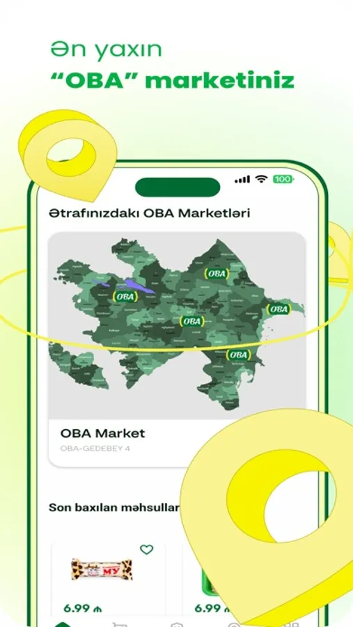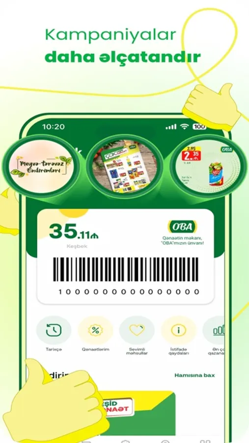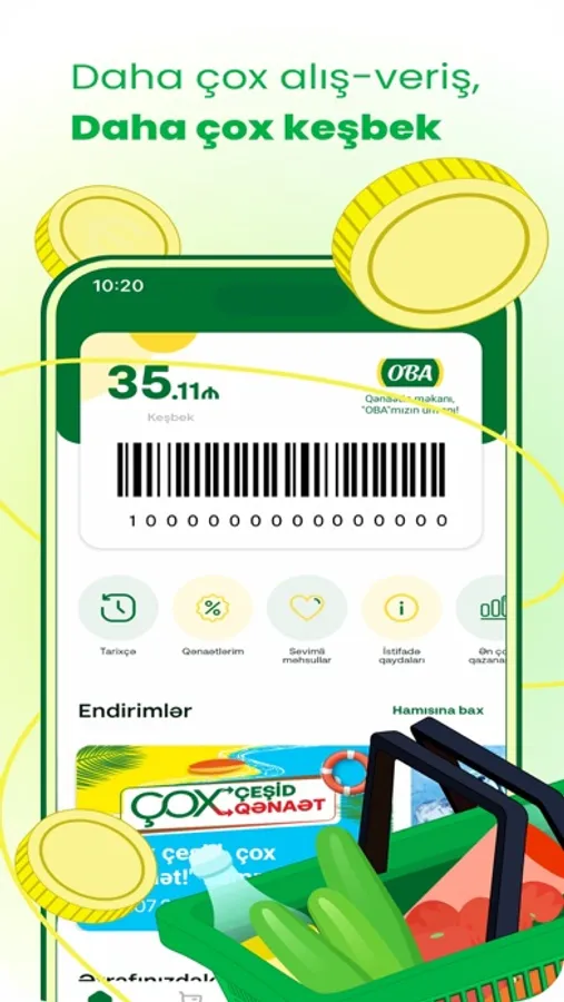 OBA Market mobil tətbiqində hər 10 AZN və daha artıq dəyərində alış-verişə görə 1% keşbek əldə edirsiniz. Eləcə də profilim bölməsində şəxsi məlumatlara baxa və şifrənizi yeniləyə bilərsiniz.