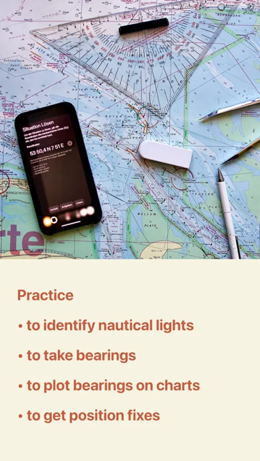"Fix at Night" turns your iPhone into a window/binoculars into the night. From a position on the training chart D 49/INT 1463 you observe the beacons and nautical lights around you and take their bearings. After you got a position fix you enter the coordinates into the app which then will tell you how far your position is off. The smaller the difference the better!