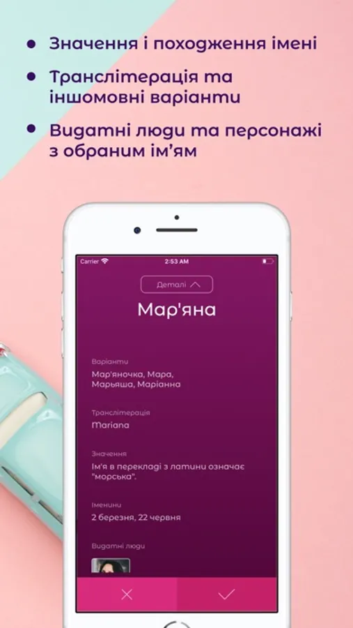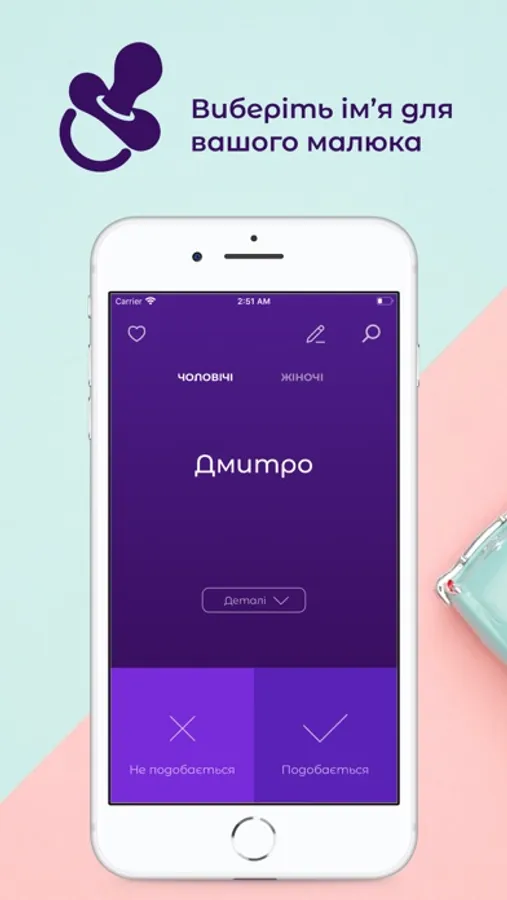Додаток “Ім’я малюка” пропонує для вибору безліч жіночих та чоловічих імен, серед яких ви точно оберете найкраще для вашого малечі.