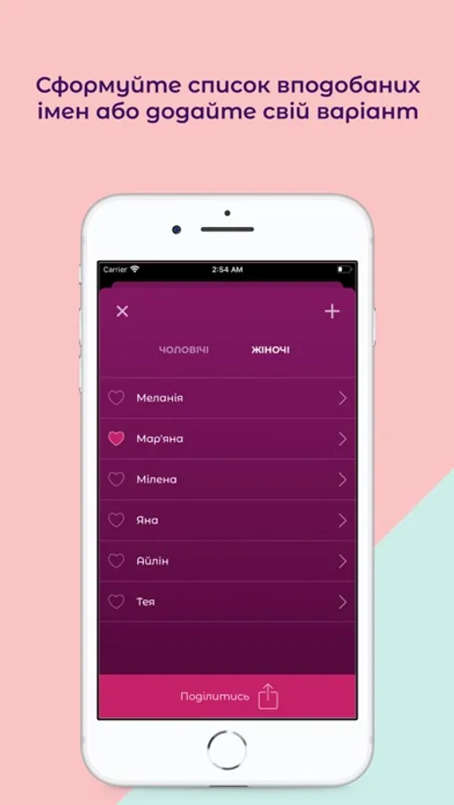 Зручна навігація та простота дозволять легко сформувати список улюблених імен та при потребі додати власний варіант.